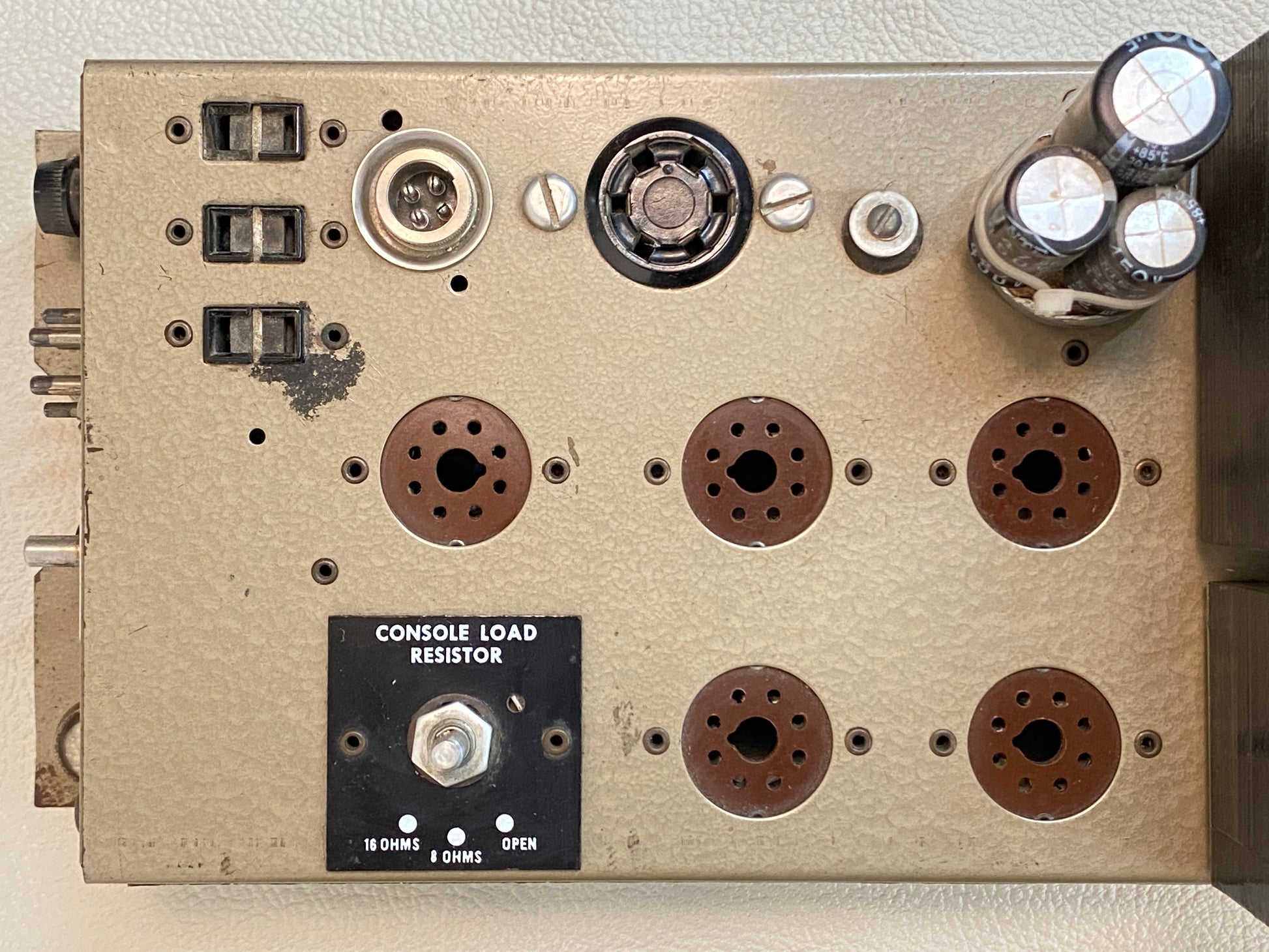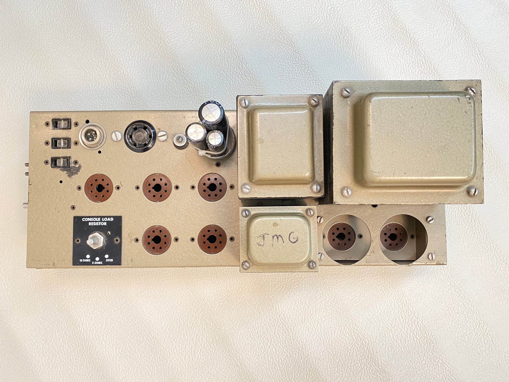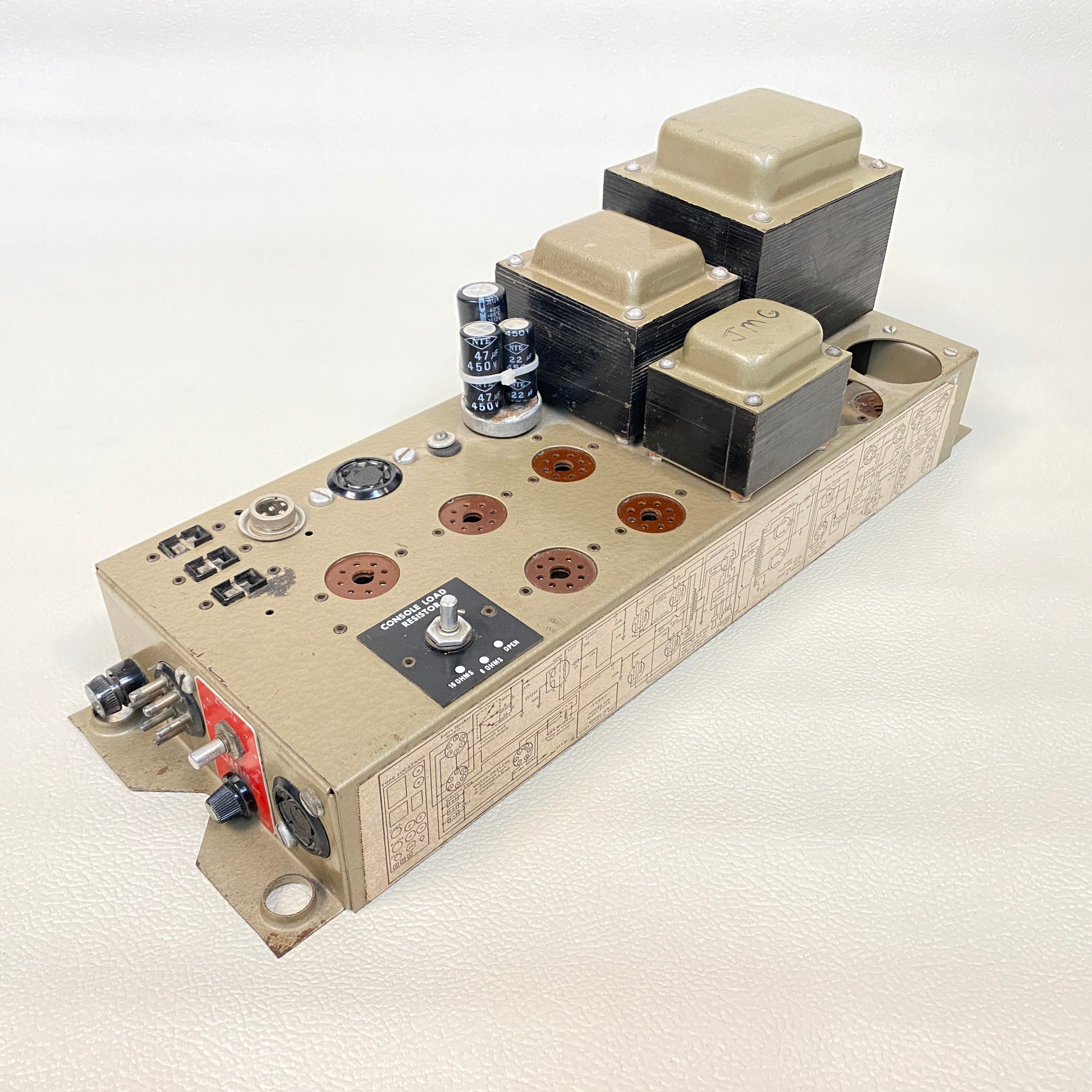 This amp was taken from a working unit and is in good shape overall with some cosmetic wear and tear throughout including a rather sloppy re-cap job (see photos). Sold as-is. Tubes and other accessories/parts not included.