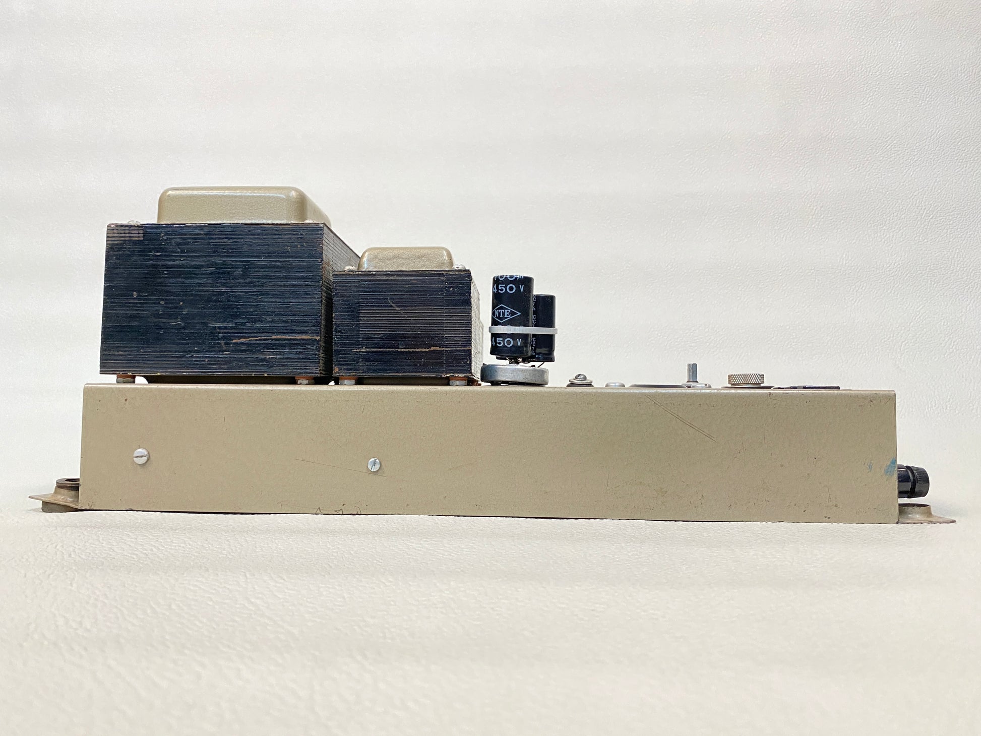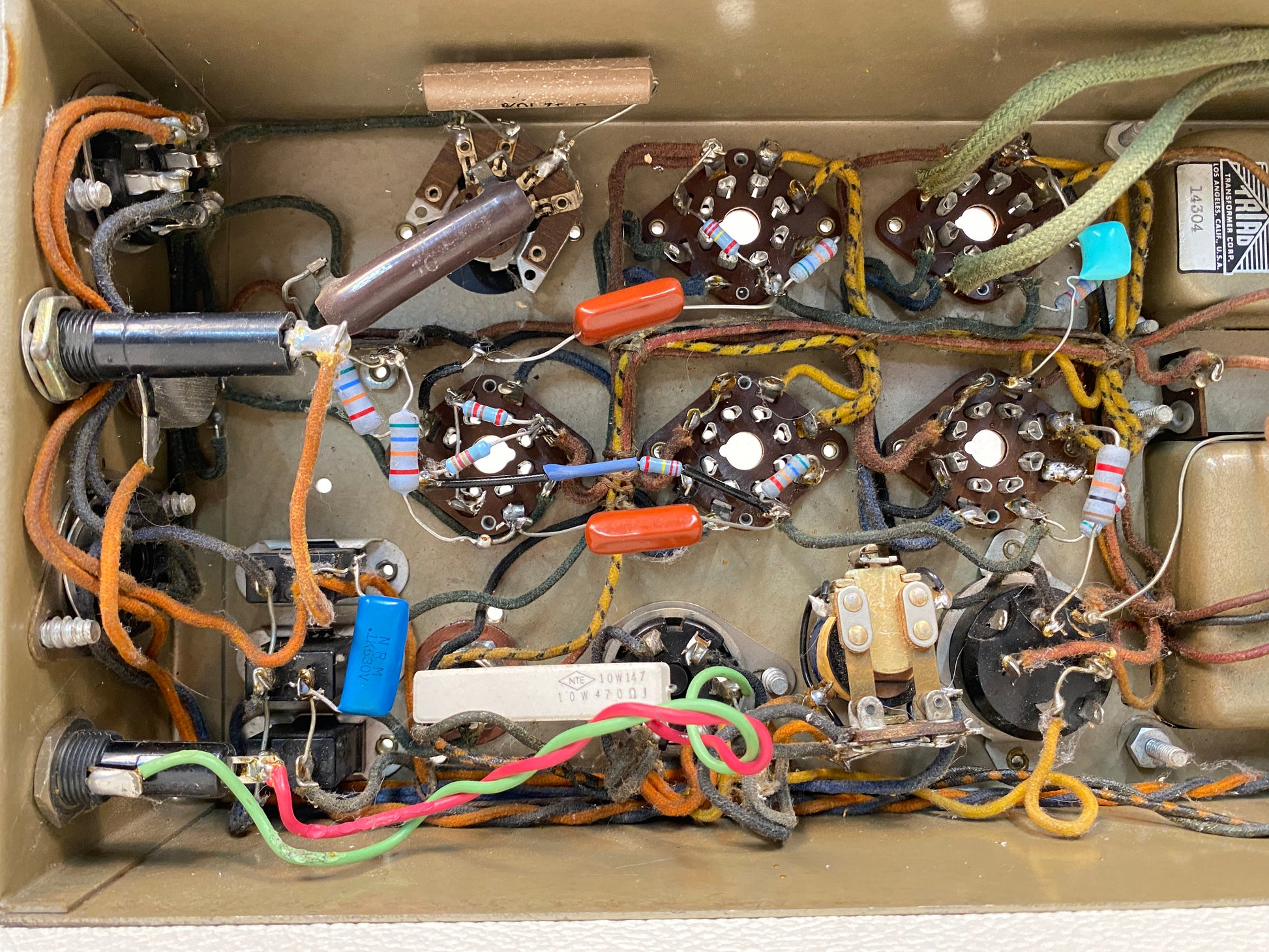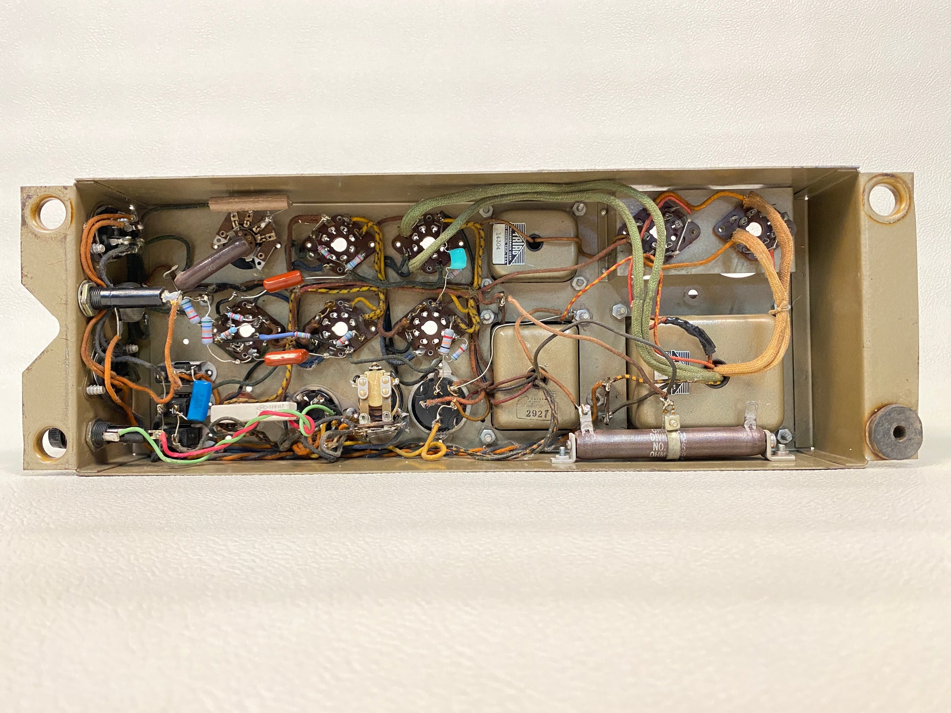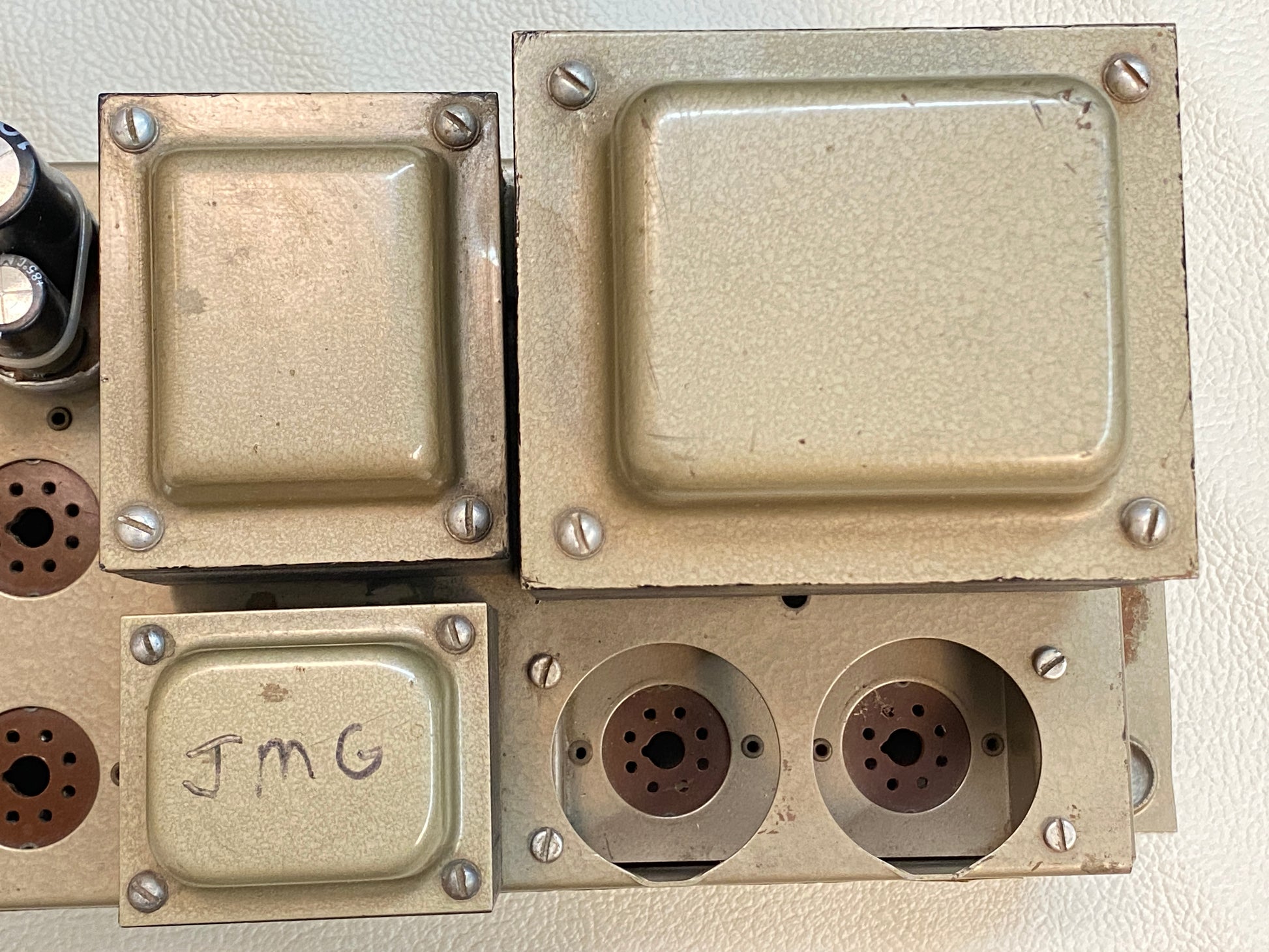 This amp was taken from a working unit and is in good shape overall with some cosmetic wear and tear throughout including a rather sloppy re-cap job (see photos). Sold as-is. Tubes and other accessories/parts not included.