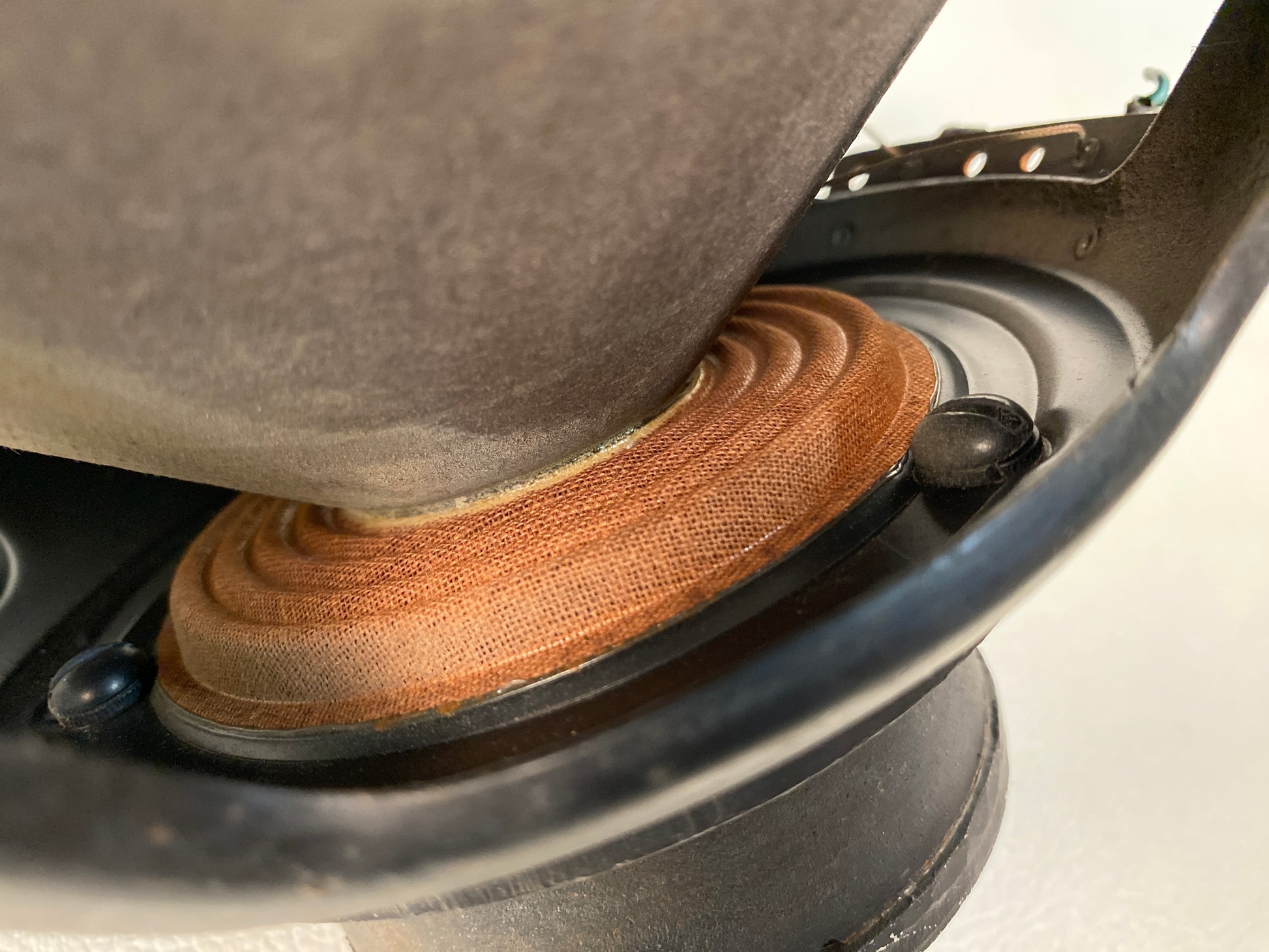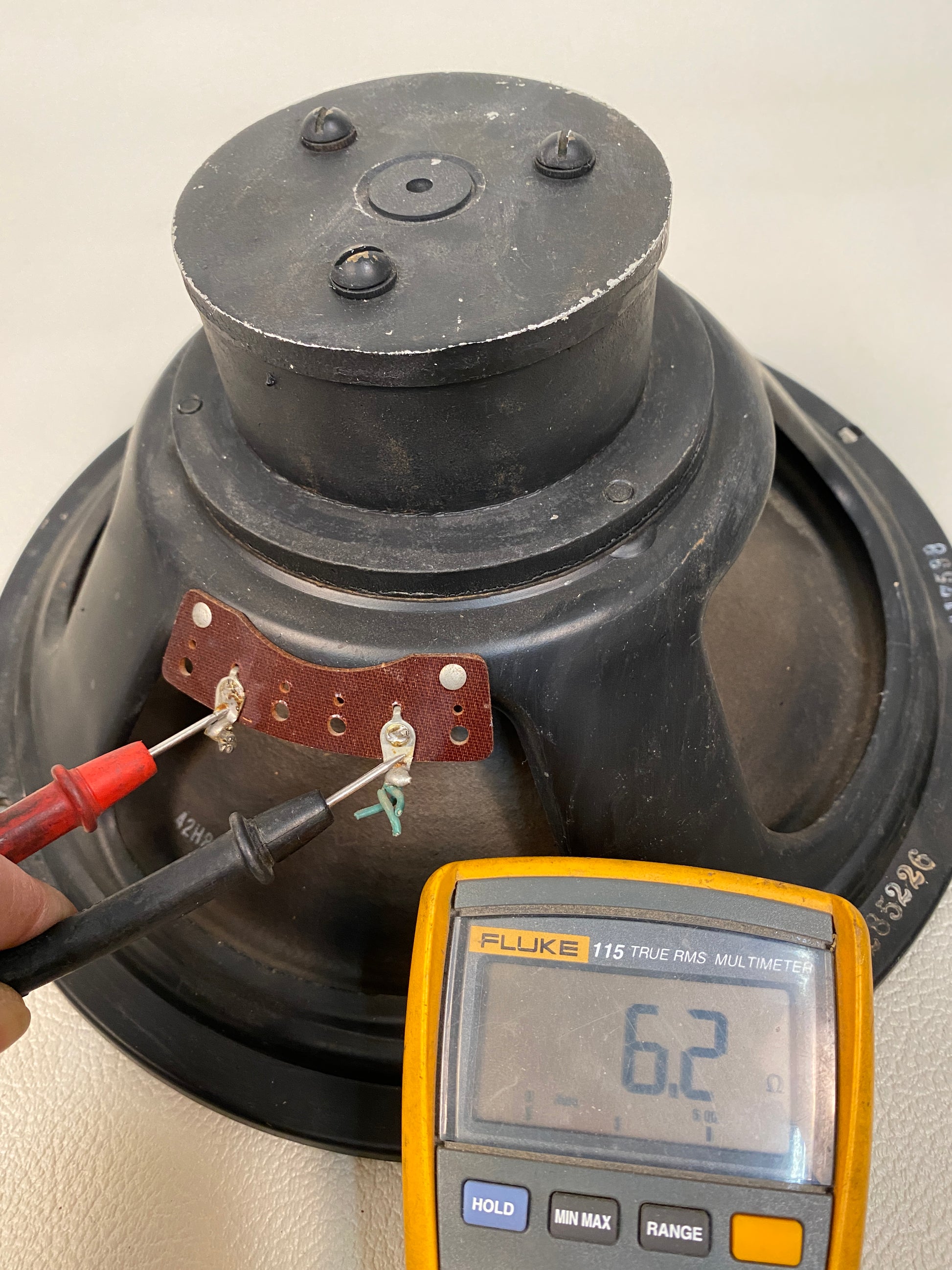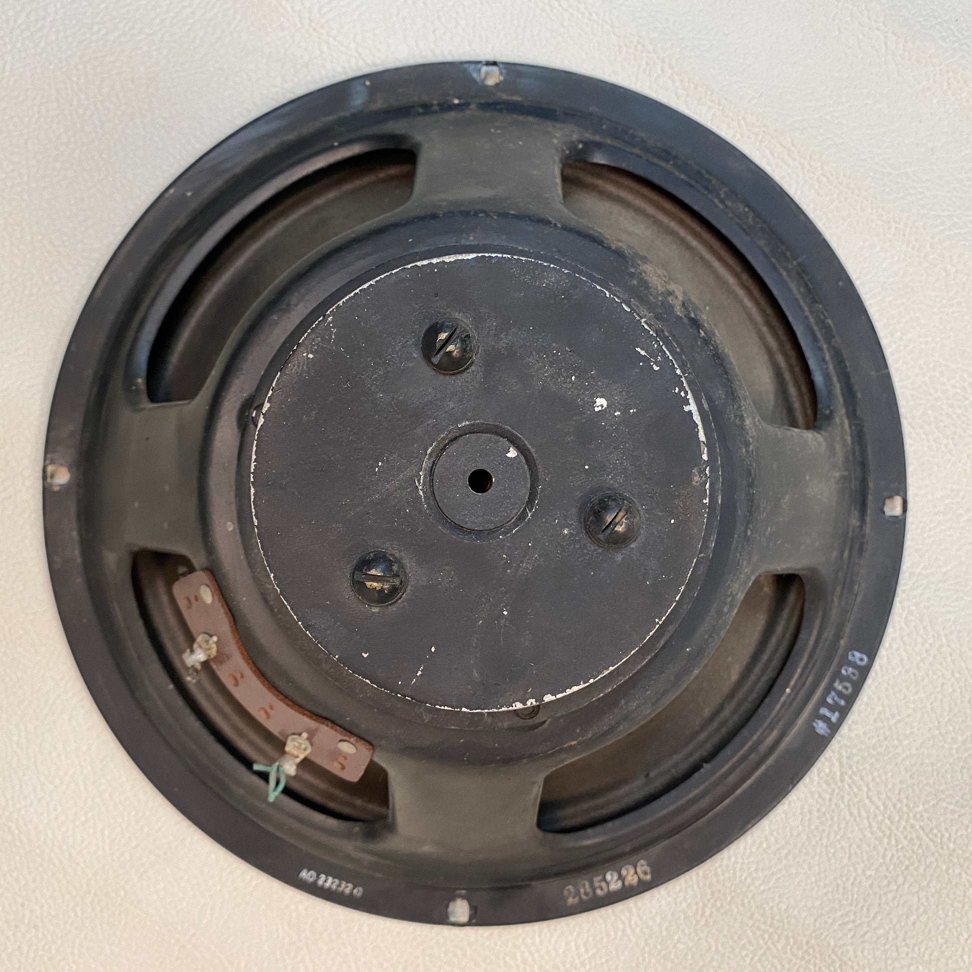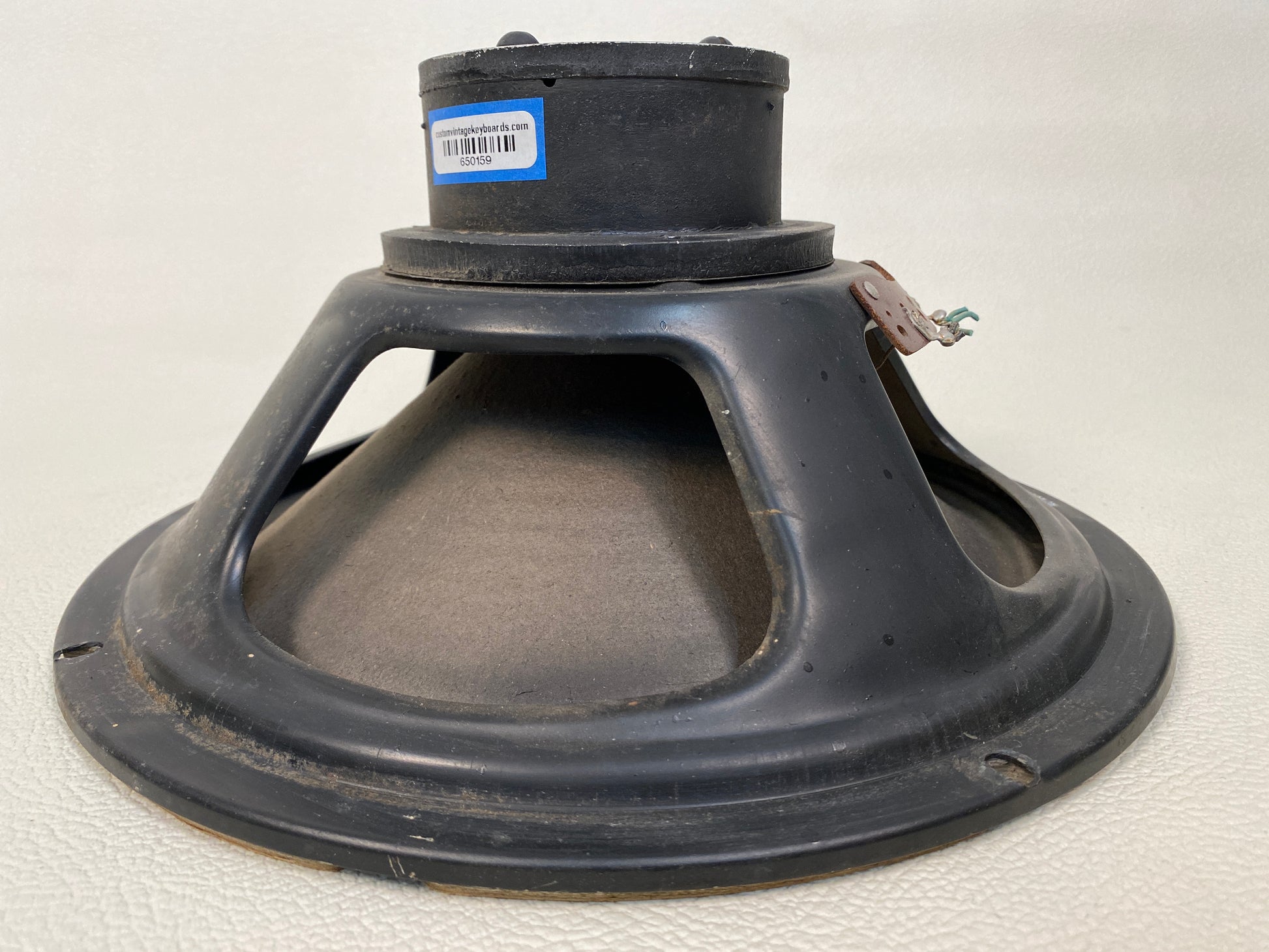 This speaker was pulled from a functional Hammond organ or tone cabinet and is marked AO-23232-0. It’s in good working shape, with some normal cosmetic wear and tear throughout (see photos).