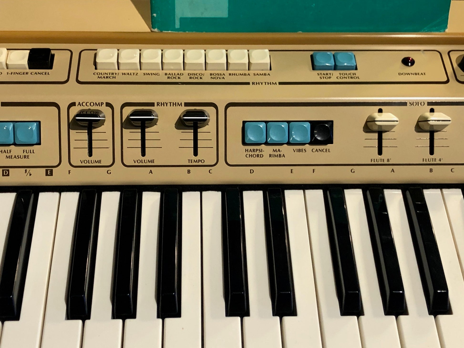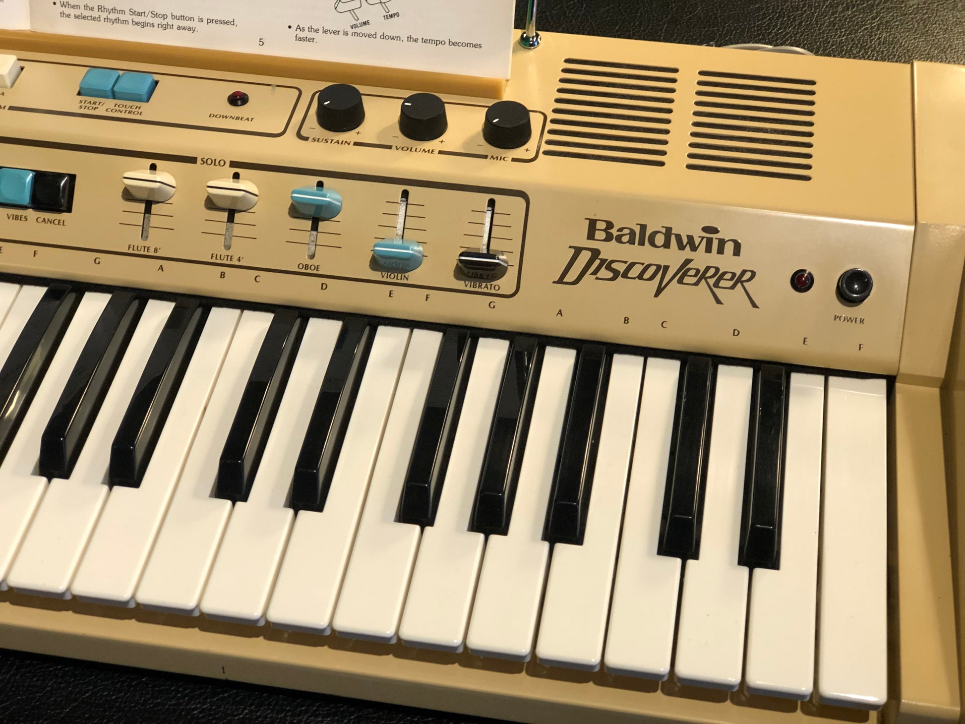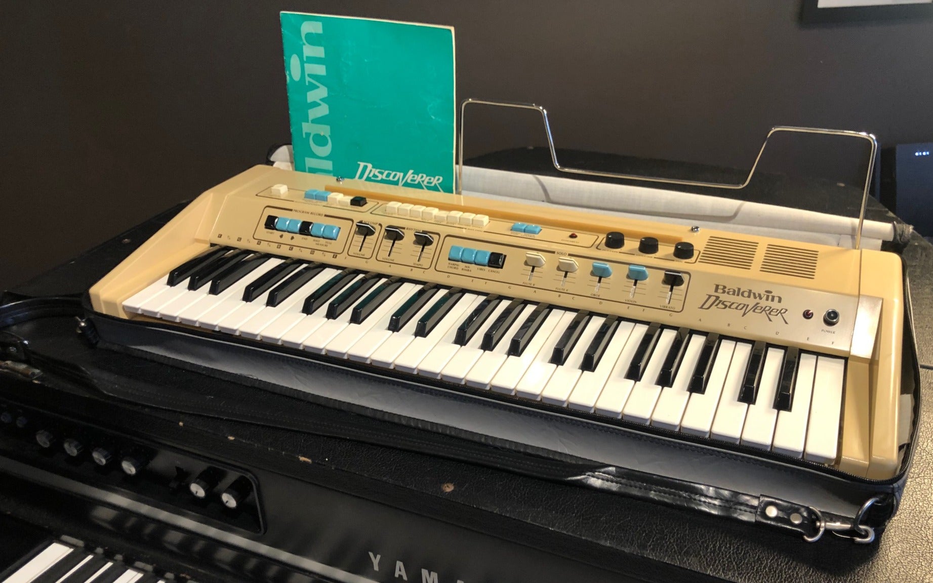 The Baldwin Discoverer DS-50 came out in mid/late 70s (pre-MIDI) and features control over the synth sounds plus a built in drum machine. All original knobs are present.