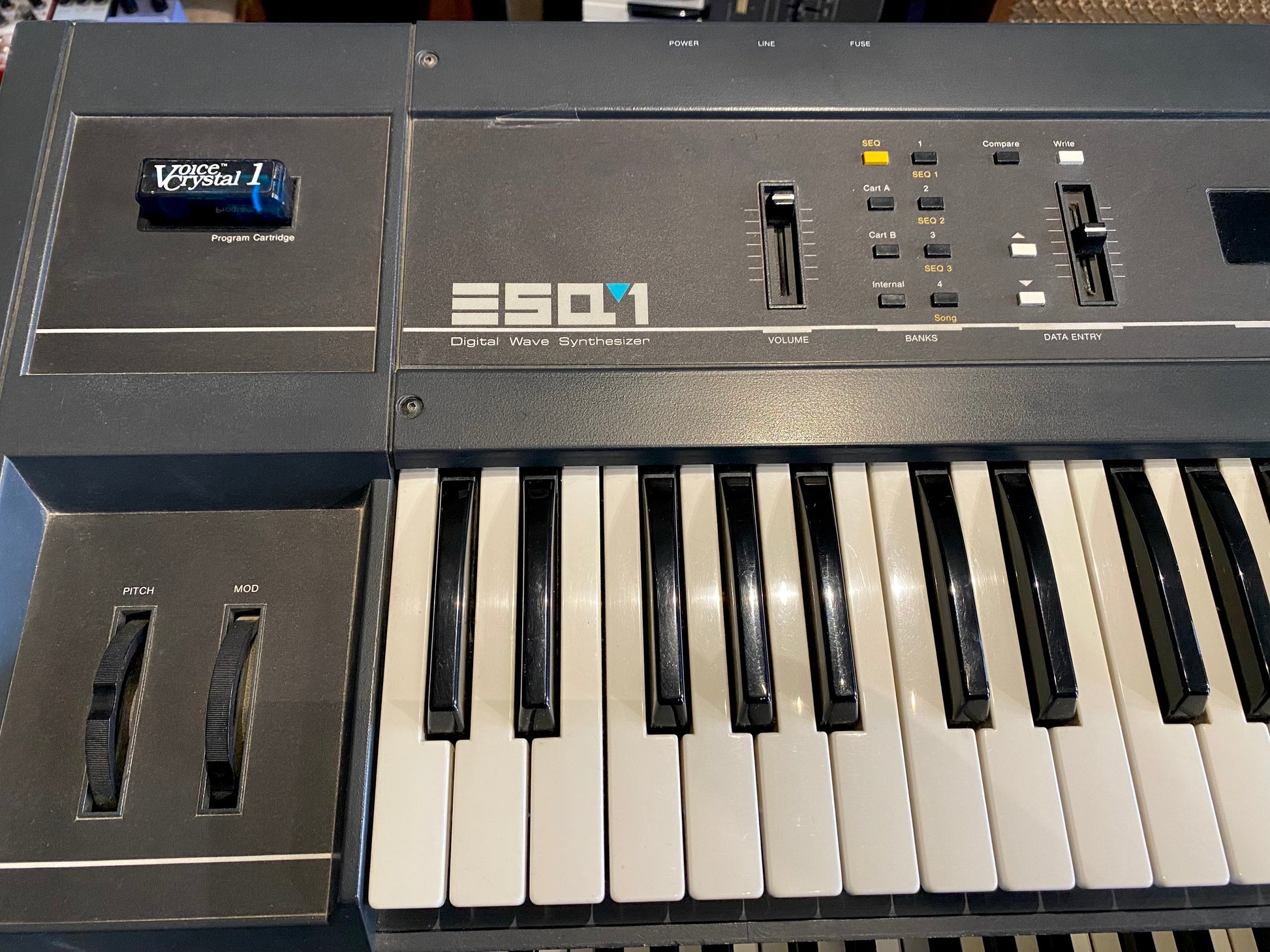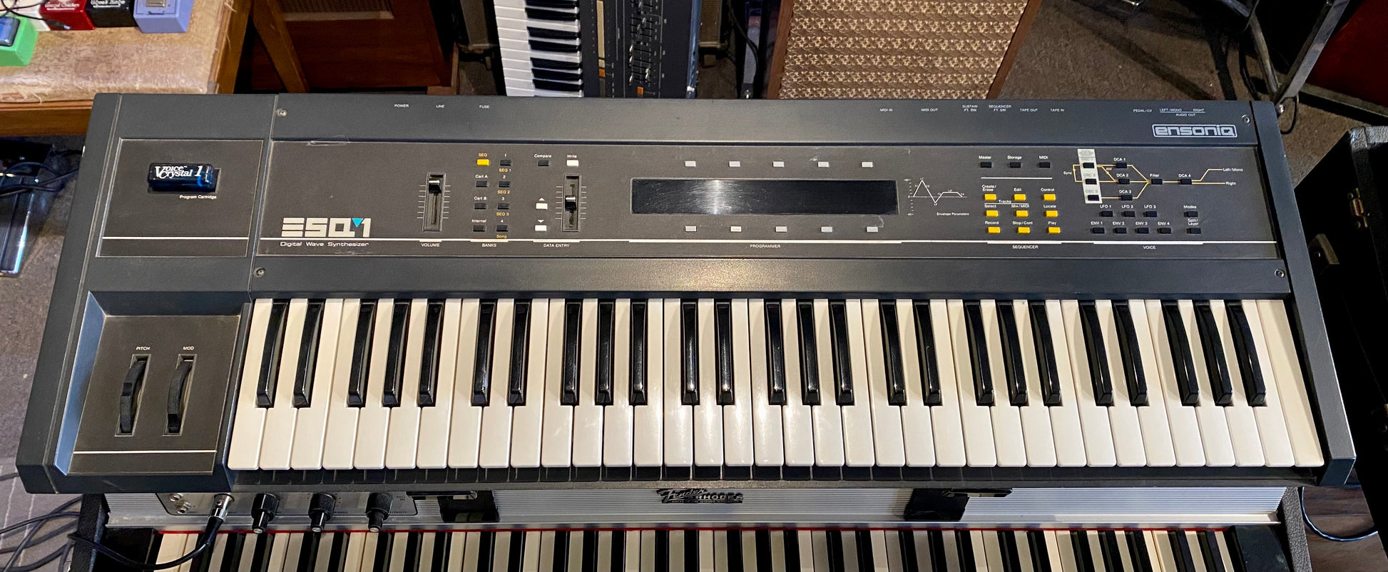Ensoniq ESQ-1 is a 61-key, velocity sensitive, eight-note, polyphonic and multitimbral synthesizer, release by Ensoniq in 1985. It was marketed as a "digital wave synthesizer" but was an early Music Workstation. Its oscillators are true digital oscillators, provided by a custom Ensoniq wavetable chip. The signal path includes analog resonant low-pass filters and an analog amplifier.