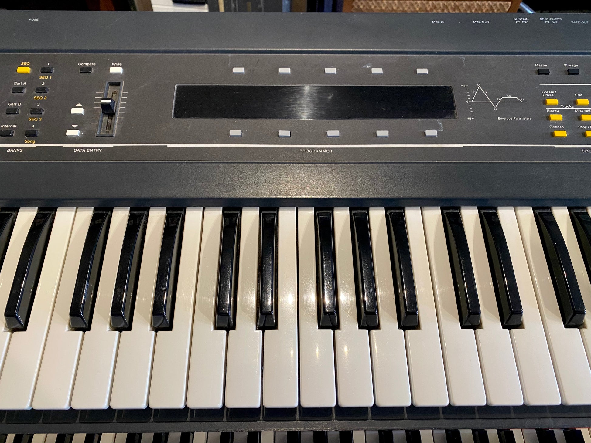 The synth also features a fully functional 8-track MIDI sequencer that can run either its internal sounds, external MIDI equipment, or both, with a capacity of 24,000 notes (expandable via cartridges). It provides quantization, step-editing, copy/paste editing, and can be synchronized with external MIDI or tape-in clock.