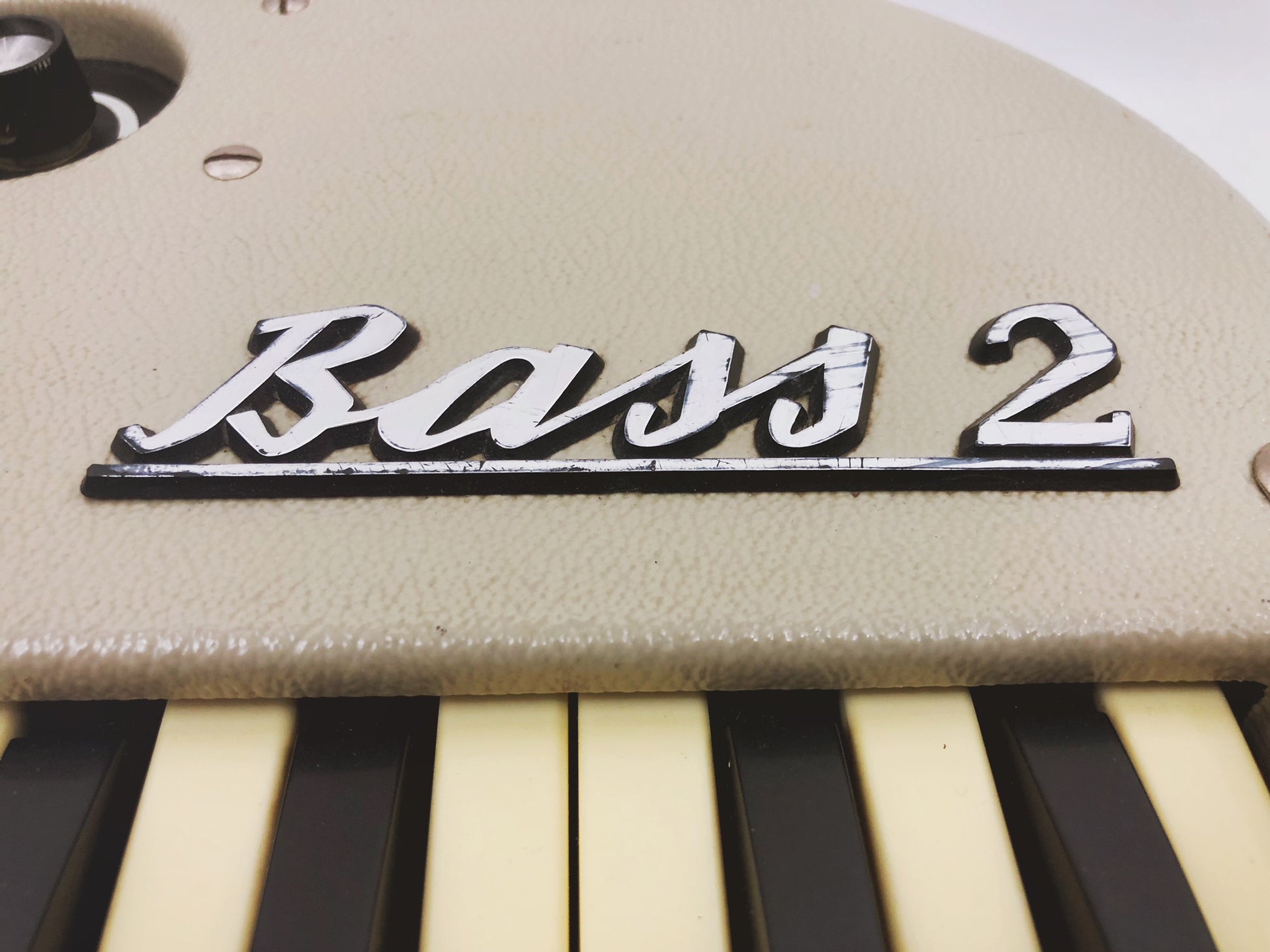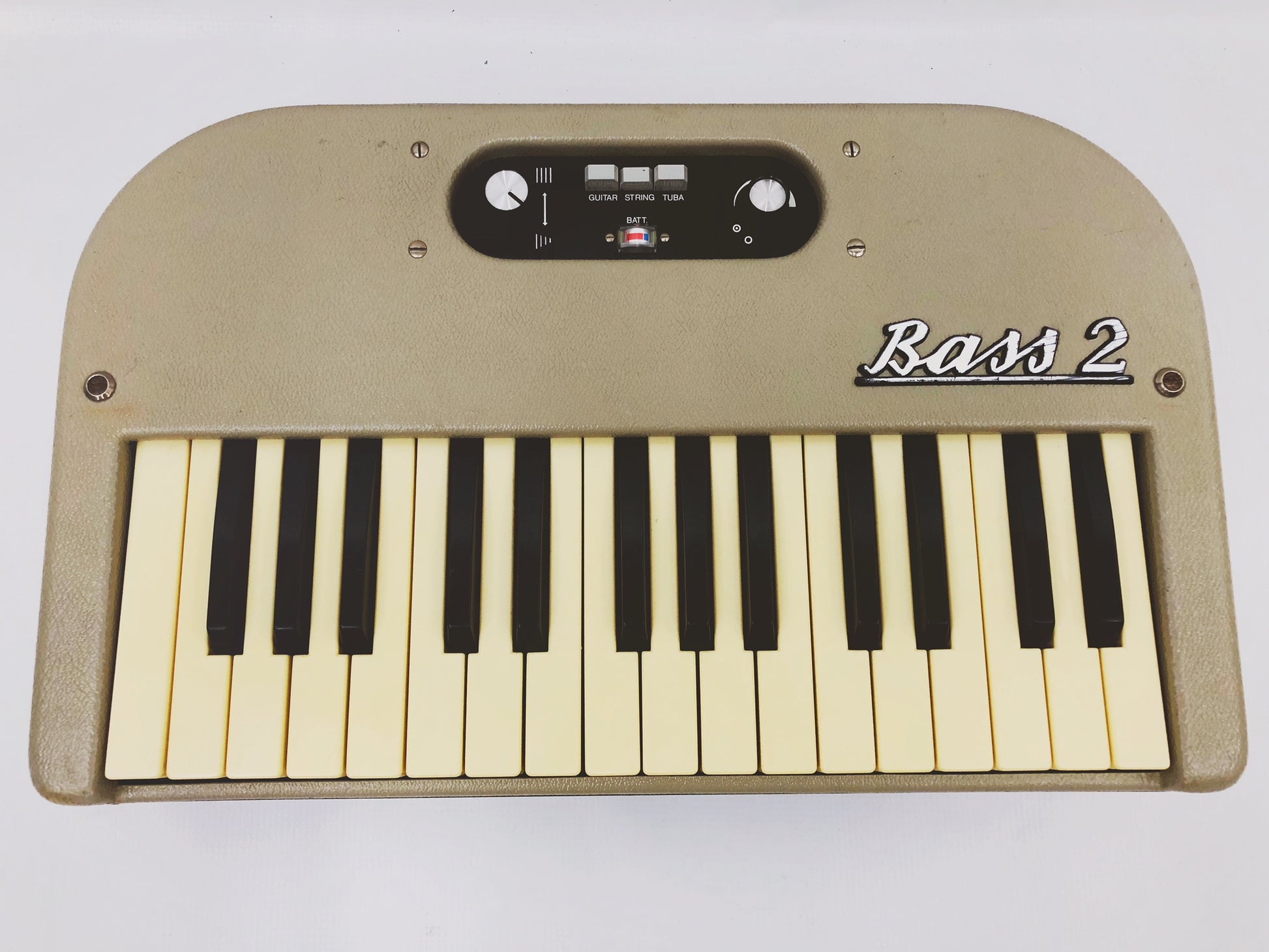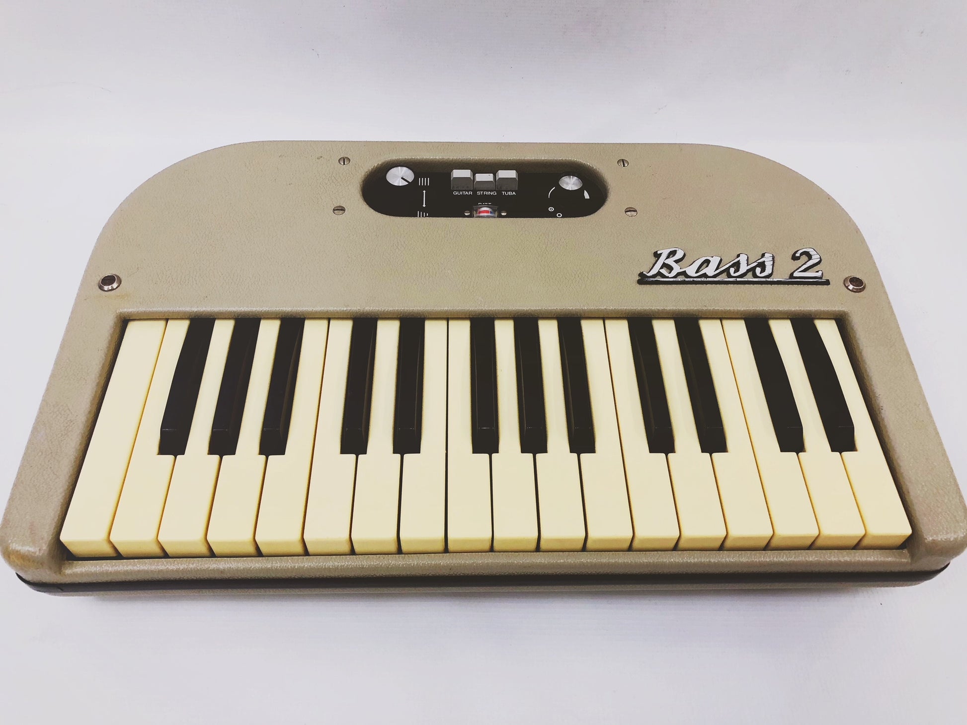 The Hohner Bass 2 is an all-electric analog synthesizer, with simple controls and a huge sub bass sound. This is one of the earliest examples of an all-electric solid state keyboard bass, built in the late '60s. Monophonic, 3 sound types, a volume and decay knob, and a line output. Can run on 110v, or a bunch of D batteries.